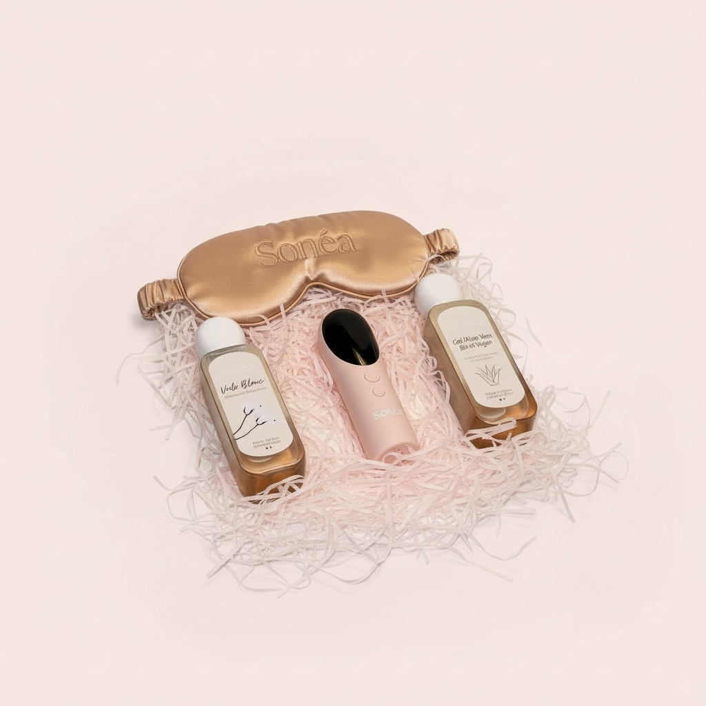 Le coffret Sonéa a été imaginé comme une expérience complète, sensorielle et émotionnelle. Chaque élément a été choisi avec soin pour accompagner la future maman en toute douceur.